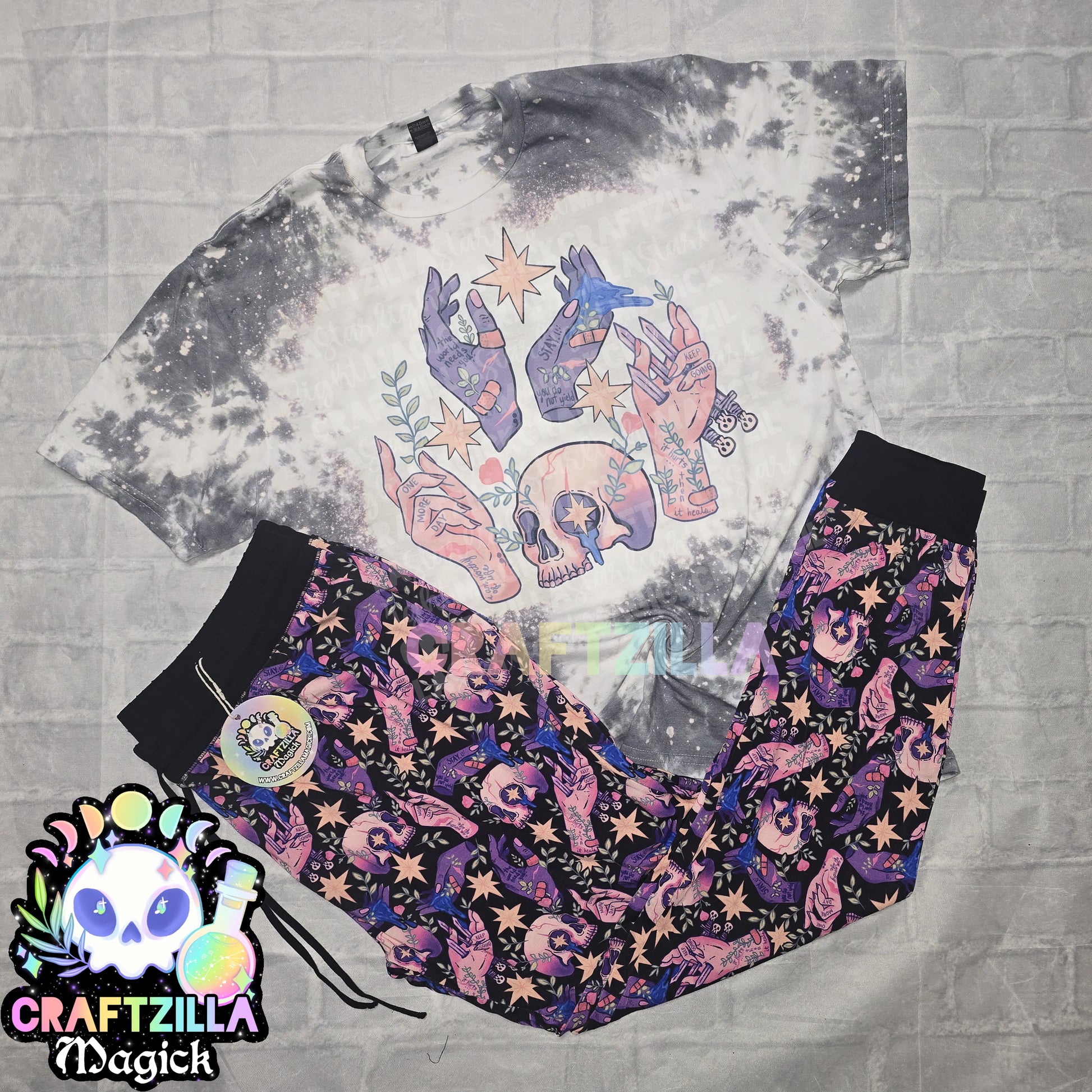 Design features cute affirmations skellie/witchy print, with black colored bands.